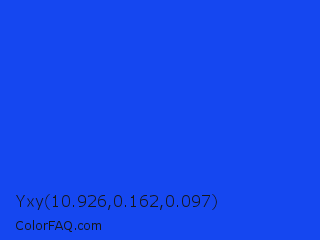 Yxy 10.926,0.162,0.097 Color is a normal blue color and the nearest color is Blue RYB #0247fe. Hex code #1547f0 and RGB value is rgb(21,71,240). In RGB color space, this color is composed of 8% red, 28% green, 94% blue, In CMYK color space, this color is composed of 91% cyan, 70% magenta, 0% yellow , 6% black , In HSL color space, this color has a hue angle of 226° , 88% saturation and 51% lightness.