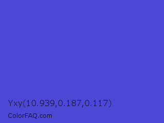 Yxy 10.939,0.187,0.117 Color is a normal indigo color and the nearest color is Iris #5a4fcf. Hex code #4d47d6 and RGB value is rgb(77,71,214). In RGB color space, this color is composed of 30% red, 28% green, 84% blue, In CMYK color space, this color is composed of 64% cyan, 67% magenta, 0% yellow , 16% black , In HSL color space, this color has a hue angle of 243° , 64% saturation and 56% lightness.