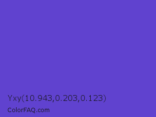 Yxy 10.943,0.203,0.123 Color is a normal indigo color and the nearest color is Iris #5a4fcf. Hex code #6042cf and RGB value is rgb(96,66,207). In RGB color space, this color is composed of 38% red, 26% green, 81% blue, In CMYK color space, this color is composed of 54% cyan, 68% magenta, 0% yellow , 19% black , In HSL color space, this color has a hue angle of 253° , 59% saturation and 54% lightness.
