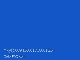Yxy 10.945,0.173,0.135 Color is a normal blue color and the nearest color is Denim #1560bd. Hex code #1356c8 and RGB value is rgb(19,86,200). In RGB color space, this color is composed of 7% red, 34% green, 78% blue, In CMYK color space, this color is composed of 91% cyan, 57% magenta, 0% yellow , 22% black , In HSL color space, this color has a hue angle of 218° , 83% saturation and 43% lightness.