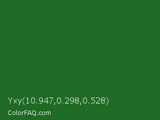 Yxy 10.947,0.298,0.528 Color is a dark green color and the nearest color is Mughal Green #306030. Hex code #1f6b26 and RGB value is rgb(31,107,38). In RGB color space, this color is composed of 12% red, 42% green, 15% blue, In CMYK color space, this color is composed of 71% cyan, 0% magenta, 64% yellow , 58% black , In HSL color space, this color has a hue angle of 126° , 55% saturation and 27% lightness.