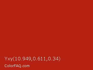 Yxy 10.949,0.611,0.34 Color is a normal red color and the nearest color is Carnelian #b31b1b. Hex code #b52110 and RGB value is rgb(181,33,16). In RGB color space, this color is composed of 71% red, 13% green, 6% blue, In CMYK color space, this color is composed of 0% cyan, 82% magenta, 91% yellow , 29% black , In HSL color space, this color has a hue angle of 6° , 84% saturation and 39% lightness.