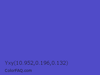 Yxy 10.952,0.196,0.132 Color is a normal indigo color and the nearest color is Iris #5a4fcf. Hex code #504bc8 and RGB value is rgb(80,75,200). In RGB color space, this color is composed of 31% red, 29% green, 78% blue, In CMYK color space, this color is composed of 60% cyan, 63% magenta, 0% yellow , 22% black , In HSL color space, this color has a hue angle of 242° , 53% saturation and 54% lightness.