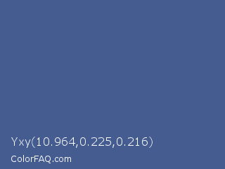Yxy 10.964,0.225,0.216 Color is a normal blue color and the nearest color is Queen Blue #436b95. Hex code #455c91 and RGB value is rgb(69,92,145). In RGB color space, this color is composed of 27% red, 36% green, 57% blue, In CMYK color space, this color is composed of 52% cyan, 37% magenta, 0% yellow , 43% black , In HSL color space, this color has a hue angle of 222° , 36% saturation and 42% lightness.