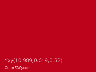 Yxy 10.989,0.619,0.32 Color is a normal red color and the nearest color is Monza #c7031e. Hex code #bd031c and RGB value is rgb(189,3,28). In RGB color space, this color is composed of 74% red, 1% green, 11% blue, In CMYK color space, this color is composed of 0% cyan, 98% magenta, 85% yellow , 26% black , In HSL color space, this color has a hue angle of 352° , 97% saturation and 38% lightness.