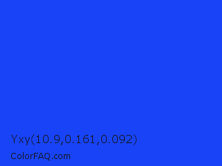 Yxy 10.9,0.161,0.092 Color is a normal blue color and the nearest color is Blue RYB #0247fe. Hex code #1843f6 and RGB value is rgb(24,67,246). In RGB color space, this color is composed of 9% red, 26% green, 96% blue, In CMYK color space, this color is composed of 90% cyan, 73% magenta, 0% yellow , 4% black , In HSL color space, this color has a hue angle of 228° , 93% saturation and 53% lightness.