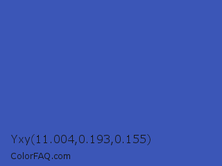 Yxy 11.004,0.193,0.155 Color is a normal blue color and the nearest color is Violet Blue #324ab2. Hex code #3b56b7 and RGB value is rgb(59,86,183). In RGB color space, this color is composed of 23% red, 34% green, 72% blue, In CMYK color space, this color is composed of 68% cyan, 53% magenta, 0% yellow , 28% black , In HSL color space, this color has a hue angle of 227° , 51% saturation and 47% lightness.