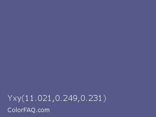 Yxy 11.021,0.249,0.231 Color is a normal blue color and the nearest color is Purple Navy #4e5180. Hex code #555a88 and RGB value is rgb(85,90,136). In RGB color space, this color is composed of 33% red, 35% green, 53% blue, In CMYK color space, this color is composed of 38% cyan, 34% magenta, 0% yellow , 47% black , In HSL color space, this color has a hue angle of 234° , 23% saturation and 43% lightness.