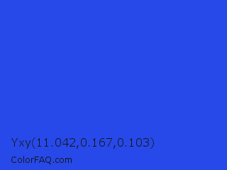 Yxy 11.042,0.167,0.103 Color is a normal blue color and the nearest color is Palatinate Blue #273be2. Hex code #2749e9 and RGB value is rgb(39,73,233). In RGB color space, this color is composed of 15% red, 29% green, 91% blue, In CMYK color space, this color is composed of 83% cyan, 69% magenta, 0% yellow , 9% black , In HSL color space, this color has a hue angle of 229° , 82% saturation and 53% lightness.