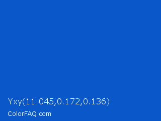 Yxy 11.045,0.172,0.136 Color is a normal blue color and the nearest color is Sapphire #0f52ba. Hex code #0957c8 and RGB value is rgb(9,87,200). In RGB color space, this color is composed of 4% red, 34% green, 78% blue, In CMYK color space, this color is composed of 96% cyan, 57% magenta, 0% yellow , 22% black , In HSL color space, this color has a hue angle of 215° , 91% saturation and 41% lightness.