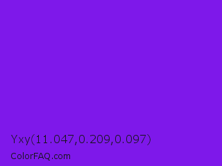 Yxy 11.047,0.209,0.097 Color is a normal violet color and the nearest color is Blue Violet #8a2be2. Hex code #7e18ea and RGB value is rgb(126,24,234). In RGB color space, this color is composed of 49% red, 9% green, 92% blue, In CMYK color space, this color is composed of 46% cyan, 90% magenta, 0% yellow , 8% black , In HSL color space, this color has a hue angle of 269° , 83% saturation and 51% lightness.