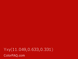 Yxy 11.049,0.633,0.331 Color is a normal red color and the nearest color is Milano Red #b81104. Hex code #bd0a06 and RGB value is rgb(189,10,6). In RGB color space, this color is composed of 74% red, 4% green, 2% blue, In CMYK color space, this color is composed of 0% cyan, 95% magenta, 97% yellow , 26% black , In HSL color space, this color has a hue angle of 1° , 94% saturation and 38% lightness.