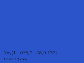 Yxy 11.076,0.178,0.133 Color is a normal blue color and the nearest color is New Car #214fc6. Hex code #2b54ca and RGB value is rgb(43,84,202). In RGB color space, this color is composed of 17% red, 33% green, 79% blue, In CMYK color space, this color is composed of 79% cyan, 58% magenta, 0% yellow , 21% black , In HSL color space, this color has a hue angle of 225° , 65% saturation and 48% lightness.