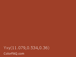 Yxy 11.079,0.534,0.36 Color is a normal red color and the nearest color is Prairie Sand #9a3820. Hex code #9f3f28 and RGB value is rgb(159,63,40). In RGB color space, this color is composed of 62% red, 25% green, 16% blue, In CMYK color space, this color is composed of 0% cyan, 60% magenta, 75% yellow , 38% black , In HSL color space, this color has a hue angle of 12° , 60% saturation and 39% lightness.