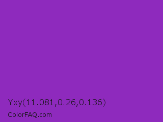 Yxy 11.081,0.26,0.136 Color is a normal purple color and the nearest color is Dark Orchid #9932cc. Hex code #8e2abd and RGB value is rgb(142,42,189). In RGB color space, this color is composed of 56% red, 16% green, 74% blue, In CMYK color space, this color is composed of 25% cyan, 78% magenta, 0% yellow , 26% black , In HSL color space, this color has a hue angle of 281° , 64% saturation and 45% lightness.