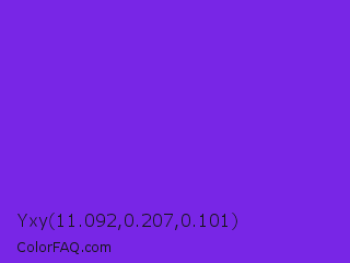 Yxy 11.092,0.207,0.101 Color is a normal violet color and the nearest color is Blue Violet #8a2be2. Hex code #7826e6 and RGB value is rgb(120,38,230). In RGB color space, this color is composed of 47% red, 15% green, 90% blue, In CMYK color space, this color is composed of 48% cyan, 83% magenta, 0% yellow , 10% black , In HSL color space, this color has a hue angle of 266° , 79% saturation and 53% lightness.