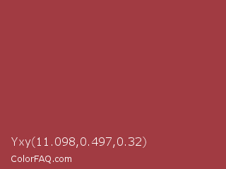 Yxy 11.098,0.497,0.32 Color is a normal red color and the nearest color is Smoky Topaz #933d41. Hex code #a13b42 and RGB value is rgb(161,59,66). In RGB color space, this color is composed of 63% red, 23% green, 26% blue, In CMYK color space, this color is composed of 0% cyan, 63% magenta, 59% yellow , 37% black , In HSL color space, this color has a hue angle of 356° , 46% saturation and 43% lightness.