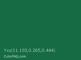 Yxy 11.103,0.265,0.444 Color is a dark green color and the nearest color is Jewel #126b40. Hex code #166b44 and RGB value is rgb(22,107,68). In RGB color space, this color is composed of 9% red, 42% green, 27% blue, In CMYK color space, this color is composed of 79% cyan, 0% magenta, 36% yellow , 58% black , In HSL color space, this color has a hue angle of 152° , 66% saturation and 25% lightness.