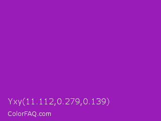 Yxy 11.112,0.279,0.139 Color is a normal purple color and the nearest color is Dark Orchid #9932cc. Hex code #991cb8 and RGB value is rgb(153,28,184). In RGB color space, this color is composed of 60% red, 11% green, 72% blue, In CMYK color space, this color is composed of 17% cyan, 85% magenta, 0% yellow , 28% black , In HSL color space, this color has a hue angle of 288° , 74% saturation and 42% lightness.