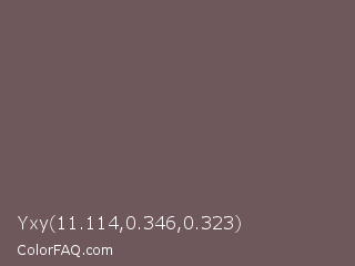 Yxy 11.114,0.346,0.323 Color is a normal red color and the nearest color is Dorado #6b5755. Hex code #6f585b and RGB value is rgb(111,88,91). In RGB color space, this color is composed of 44% red, 35% green, 36% blue, In CMYK color space, this color is composed of 0% cyan, 21% magenta, 18% yellow , 56% black , In HSL color space, this color has a hue angle of 352° , 12% saturation and 39% lightness.