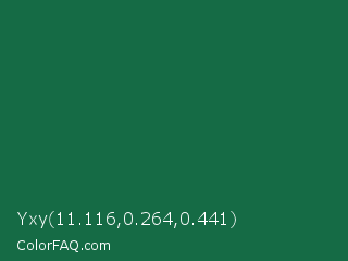 Yxy 11.116,0.264,0.441 Color is a dark green color and the nearest color is Jewel #126b40. Hex code #156b45 and RGB value is rgb(21,107,69). In RGB color space, this color is composed of 8% red, 42% green, 27% blue, In CMYK color space, this color is composed of 80% cyan, 0% magenta, 36% yellow , 58% black , In HSL color space, this color has a hue angle of 153° , 67% saturation and 25% lightness.