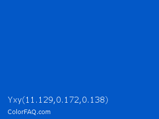Yxy 11.129,0.172,0.138 Color is a normal blue color and the nearest color is Science Blue #0066cc. Hex code #0358c7 and RGB value is rgb(3,88,199). In RGB color space, this color is composed of 1% red, 35% green, 78% blue, In CMYK color space, this color is composed of 98% cyan, 56% magenta, 0% yellow , 22% black , In HSL color space, this color has a hue angle of 214° , 97% saturation and 40% lightness.