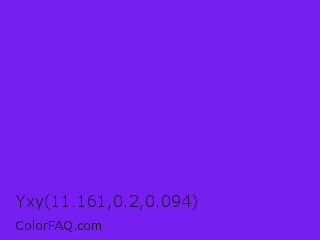 Yxy 11.161,0.2,0.094 Color is a normal violet color and the nearest color is Blue Violet #8a2be2. Hex code #761ff1 and RGB value is rgb(118,31,241). In RGB color space, this color is composed of 46% red, 12% green, 95% blue, In CMYK color space, this color is composed of 51% cyan, 87% magenta, 0% yellow , 5% black , In HSL color space, this color has a hue angle of 265° , 88% saturation and 53% lightness.