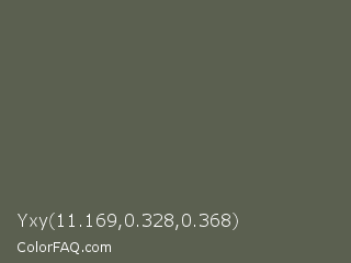 Yxy 11.169,0.328,0.368 Color is a normal lime color and the nearest color is Ebony #555d50. Hex code #5b6050 and RGB value is rgb(91,96,80). In RGB color space, this color is composed of 36% red, 38% green, 31% blue, In CMYK color space, this color is composed of 5% cyan, 0% magenta, 17% yellow , 62% black , In HSL color space, this color has a hue angle of 79° , 9% saturation and 35% lightness.