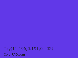 Yxy 11.196,0.191,0.102 Color is a normal indigo color and the nearest color is Majorelle Blue #6050dc. Hex code #6138e8 and RGB value is rgb(97,56,232). In RGB color space, this color is composed of 38% red, 22% green, 91% blue, In CMYK color space, this color is composed of 58% cyan, 76% magenta, 0% yellow , 9% black , In HSL color space, this color has a hue angle of 254° , 79% saturation and 56% lightness.