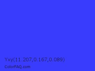 Yxy 11.207,0.167,0.089 Color is a light blue color and the nearest color is Palatinate Blue #273be2. Hex code #3a3cfd and RGB value is rgb(58,60,253). In RGB color space, this color is composed of 23% red, 24% green, 99% blue, In CMYK color space, this color is composed of 77% cyan, 76% magenta, 0% yellow , 1% black , In HSL color space, this color has a hue angle of 239° , 98% saturation and 61% lightness.