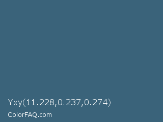Yxy 11.228,0.237,0.274 Color is a normal blue color and the nearest color is William #3a686c. Hex code #3a637a and RGB value is rgb(58,99,122). In RGB color space, this color is composed of 23% red, 39% green, 48% blue, In CMYK color space, this color is composed of 52% cyan, 19% magenta, 0% yellow , 52% black , In HSL color space, this color has a hue angle of 202° , 36% saturation and 35% lightness.
