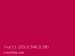 Yxy 11.233,0.546,0.28 Color is a normal rose color and the nearest color is Pictorial Carmine #c30b4e. Hex code #bc0447 and RGB value is rgb(188,4,71). In RGB color space, this color is composed of 74% red, 2% green, 28% blue, In CMYK color space, this color is composed of 0% cyan, 98% magenta, 62% yellow , 26% black , In HSL color space, this color has a hue angle of 338° , 96% saturation and 38% lightness.