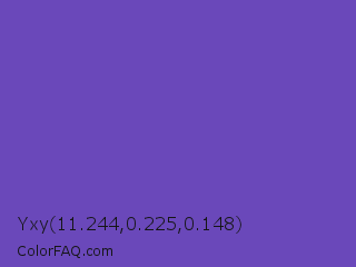 Yxy 11.244,0.225,0.148 Color is a normal indigo color and the nearest color is Studio #714ab2. Hex code #6a48ba and RGB value is rgb(106,72,186). In RGB color space, this color is composed of 42% red, 28% green, 73% blue, In CMYK color space, this color is composed of 43% cyan, 61% magenta, 0% yellow , 27% black , In HSL color space, this color has a hue angle of 258° , 45% saturation and 51% lightness.