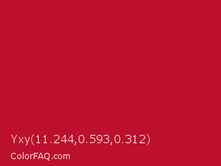 Yxy 11.244,0.593,0.312 Color is a normal red color and the nearest color is Shiraz #b20931. Hex code #bc102c and RGB value is rgb(188,16,44). In RGB color space, this color is composed of 74% red, 6% green, 17% blue, In CMYK color space, this color is composed of 0% cyan, 91% magenta, 77% yellow , 26% black , In HSL color space, this color has a hue angle of 350° , 84% saturation and 40% lightness.