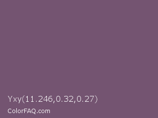 Yxy 11.246,0.32,0.27 Color is a normal magenta color and the nearest color is Salt Box #685e6e. Hex code #745471 and RGB value is rgb(116,84,113). In RGB color space, this color is composed of 45% red, 33% green, 44% blue, In CMYK color space, this color is composed of 0% cyan, 28% magenta, 3% yellow , 55% black , In HSL color space, this color has a hue angle of 306° , 16% saturation and 39% lightness.