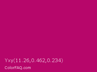 Yxy 11.26,0.462,0.234 Color is a normal magenta color and the nearest color is Lipstick #ab0563. Hex code #b7066a and RGB value is rgb(183,6,106). In RGB color space, this color is composed of 72% red, 2% green, 42% blue, In CMYK color space, this color is composed of 0% cyan, 97% magenta, 42% yellow , 28% black , In HSL color space, this color has a hue angle of 326° , 94% saturation and 37% lightness.