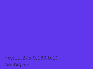Yxy 11.275,0.189,0.1 Color is a normal indigo color and the nearest color is Majorelle Blue #6050dc. Hex code #6037ec and RGB value is rgb(96,55,236). In RGB color space, this color is composed of 38% red, 22% green, 93% blue, In CMYK color space, this color is composed of 59% cyan, 77% magenta, 0% yellow , 7% black , In HSL color space, this color has a hue angle of 254° , 83% saturation and 57% lightness.