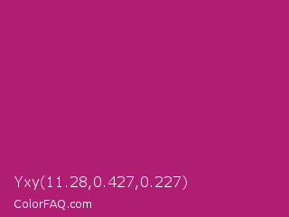 Yxy 11.28,0.427,0.227 Color is a normal magenta color and the nearest color is Hibiscus #b6316c. Hex code #af1e73 and RGB value is rgb(175,30,115). In RGB color space, this color is composed of 69% red, 12% green, 45% blue, In CMYK color space, this color is composed of 0% cyan, 83% magenta, 34% yellow , 31% black , In HSL color space, this color has a hue angle of 325° , 71% saturation and 40% lightness.