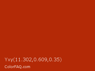 Yxy 11.302,0.609,0.35 Color is a normal red color and the nearest color is Rufous #a81c07. Hex code #b42906 and RGB value is rgb(180,41,6). In RGB color space, this color is composed of 71% red, 16% green, 2% blue, In CMYK color space, this color is composed of 0% cyan, 77% magenta, 97% yellow , 29% black , In HSL color space, this color has a hue angle of 12° , 94% saturation and 36% lightness.