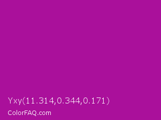 Yxy 11.314,0.344,0.171 Color is a normal magenta color and the nearest color is Violet Eggplant #991199. Hex code #aa109b and RGB value is rgb(170,16,155). In RGB color space, this color is composed of 67% red, 6% green, 61% blue, In CMYK color space, this color is composed of 0% cyan, 91% magenta, 9% yellow , 33% black , In HSL color space, this color has a hue angle of 306° , 83% saturation and 36% lightness.