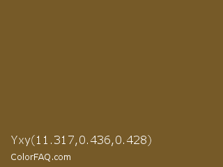 Yxy 11.317,0.436,0.428 Color is a normal orange color and the nearest color is Field Drab #6c541e. Hex code #765a28 and RGB value is rgb(118,90,40). In RGB color space, this color is composed of 46% red, 35% green, 16% blue, In CMYK color space, this color is composed of 0% cyan, 24% magenta, 66% yellow , 54% black , In HSL color space, this color has a hue angle of 38° , 49% saturation and 31% lightness.