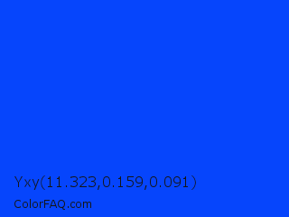 Yxy 11.323,0.159,0.091 Color is a normal blue color and the nearest color is Blue RYB #0247fe. Hex code #0645fc and RGB value is rgb(6,69,252). In RGB color space, this color is composed of 2% red, 27% green, 99% blue, In CMYK color space, this color is composed of 98% cyan, 73% magenta, 0% yellow , 1% black , In HSL color space, this color has a hue angle of 225° , 98% saturation and 51% lightness.