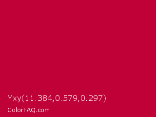 Yxy 11.384,0.579,0.297 Color is a normal rose color and the nearest color is Crimson Glory #be0032. Hex code #bf0138 and RGB value is rgb(191,1,56). In RGB color space, this color is composed of 75% red, 0% green, 22% blue, In CMYK color space, this color is composed of 0% cyan, 99% magenta, 71% yellow , 25% black , In HSL color space, this color has a hue angle of 343° , 99% saturation and 38% lightness.