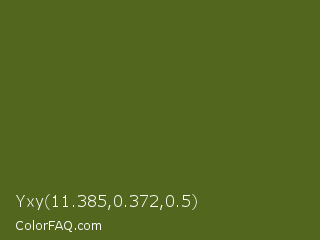Yxy 11.385,0.372,0.5 Color is a dark lime color and the nearest color is Dark Moss Green #4a5d23. Hex code #52661d and RGB value is rgb(82,102,29). In RGB color space, this color is composed of 32% red, 40% green, 11% blue, In CMYK color space, this color is composed of 20% cyan, 0% magenta, 72% yellow , 60% black , In HSL color space, this color has a hue angle of 76° , 56% saturation and 26% lightness.