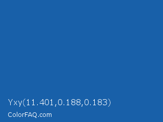 Yxy 11.401,0.188,0.183 Color is a normal blue color and the nearest color is Fun Blue #1959a8. Hex code #1860a9 and RGB value is rgb(24,96,169). In RGB color space, this color is composed of 9% red, 38% green, 66% blue, In CMYK color space, this color is composed of 86% cyan, 43% magenta, 0% yellow , 34% black , In HSL color space, this color has a hue angle of 210° , 75% saturation and 38% lightness.