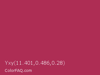 Yxy 11.401,0.486,0.28 Color is a normal rose color and the nearest color is Amaranth Purple #ab274f. Hex code #ad2d54 and RGB value is rgb(173,45,84). In RGB color space, this color is composed of 68% red, 18% green, 33% blue, In CMYK color space, this color is composed of 0% cyan, 74% magenta, 51% yellow , 32% black , In HSL color space, this color has a hue angle of 342° , 59% saturation and 43% lightness.