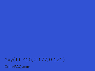 Yxy 11.416,0.177,0.125 Color is a normal blue color and the nearest color is New Car #214fc6. Hex code #3152d4 and RGB value is rgb(49,82,212). In RGB color space, this color is composed of 19% red, 32% green, 83% blue, In CMYK color space, this color is composed of 77% cyan, 61% magenta, 0% yellow , 17% black , In HSL color space, this color has a hue angle of 228° , 65% saturation and 51% lightness.