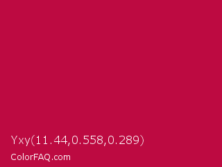 Yxy 11.44,0.558,0.289 Color is a normal rose color and the nearest color is Pictorial Carmine #c30b4e. Hex code #bd0a41 and RGB value is rgb(189,10,65). In RGB color space, this color is composed of 74% red, 4% green, 25% blue, In CMYK color space, this color is composed of 0% cyan, 95% magenta, 66% yellow , 26% black , In HSL color space, this color has a hue angle of 342° , 90% saturation and 39% lightness.