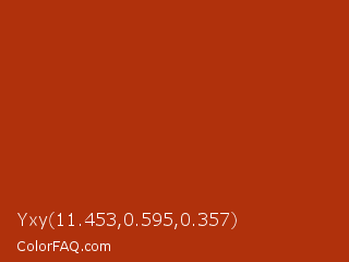 Yxy 11.453,0.595,0.357 Color is a normal red color and the nearest color is Rust #b7410e. Hex code #b0310c and RGB value is rgb(176,49,12). In RGB color space, this color is composed of 69% red, 19% green, 5% blue, In CMYK color space, this color is composed of 0% cyan, 72% magenta, 93% yellow , 31% black , In HSL color space, this color has a hue angle of 14° , 87% saturation and 37% lightness.