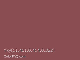 Yxy 11.461,0.414,0.322 Color is a normal red color and the nearest color is Copper Rust #944747. Hex code #8a4e52 and RGB value is rgb(138,78,82). In RGB color space, this color is composed of 54% red, 31% green, 32% blue, In CMYK color space, this color is composed of 0% cyan, 43% magenta, 41% yellow , 46% black , In HSL color space, this color has a hue angle of 356° , 28% saturation and 42% lightness.